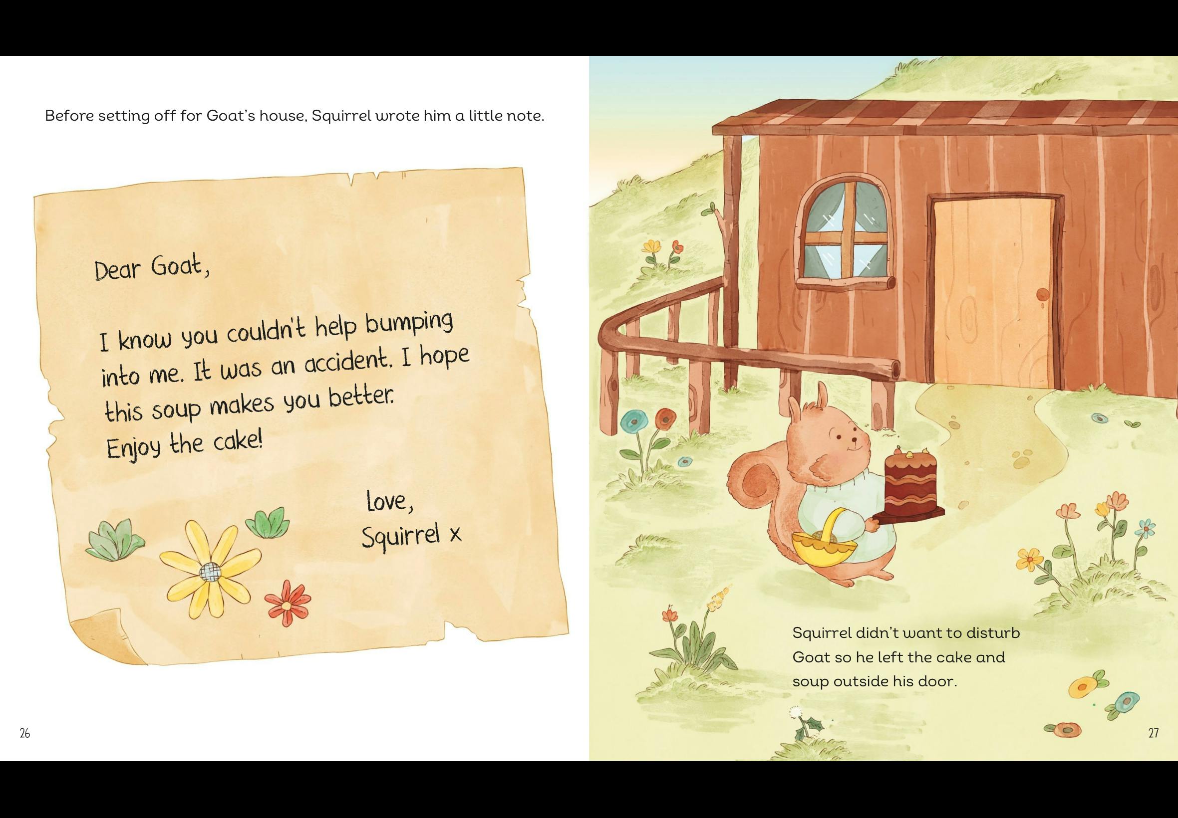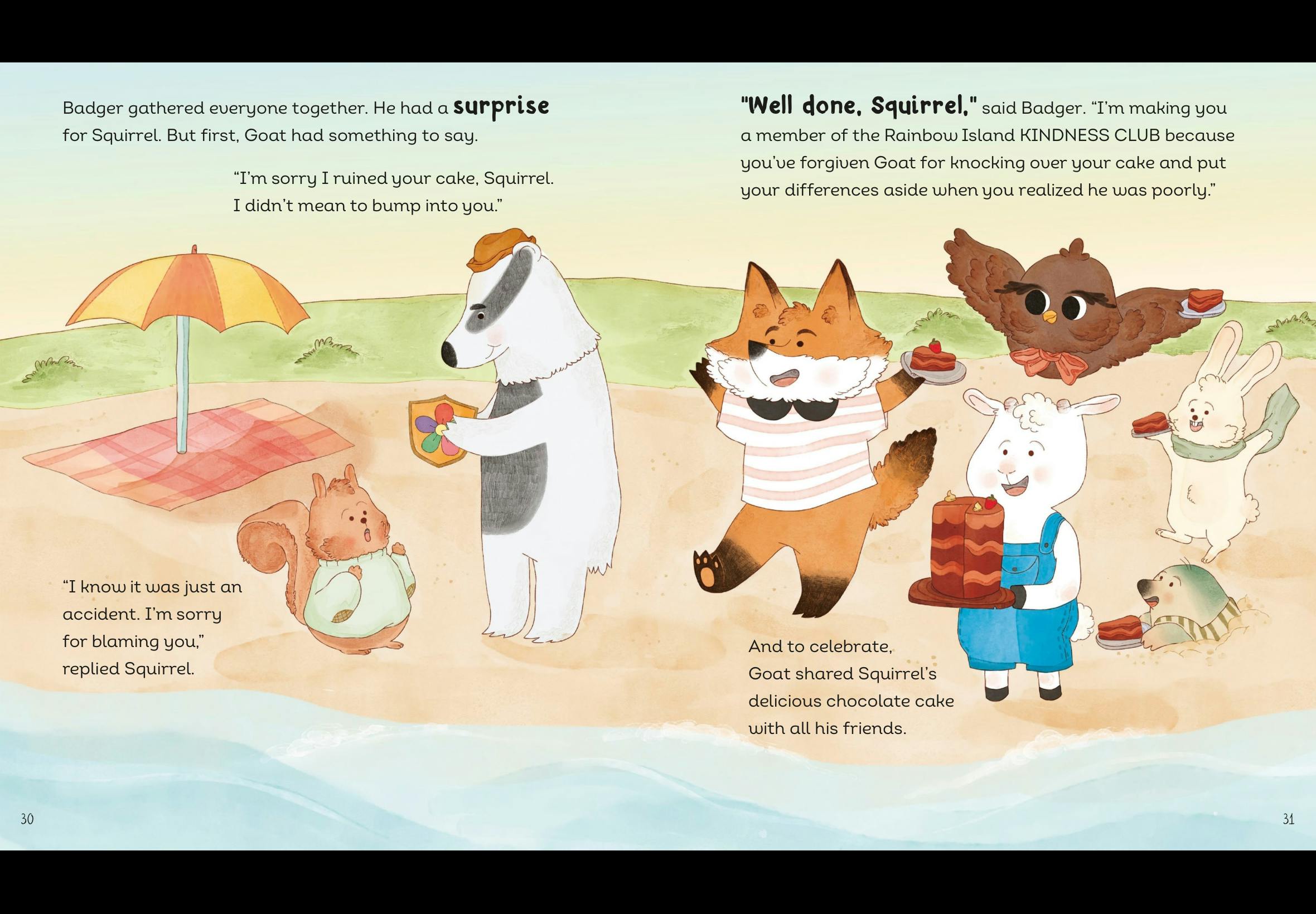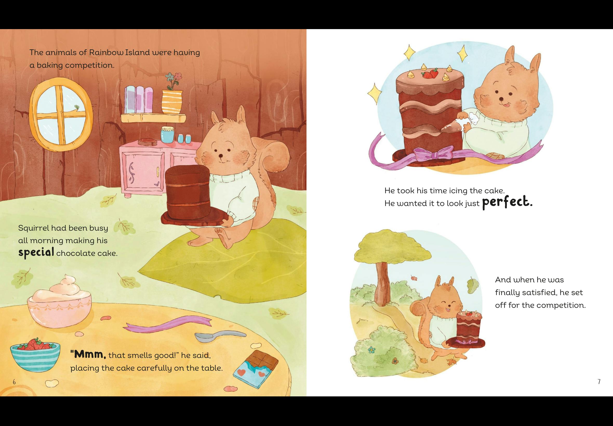 Rainbow Island is having a baking competition! Squirrel sets off with his famous chocolate cake, but when Goat crashes into him, the cake goes flying. Squirrel is inconsolable. However, he later finds out that it was an accident. Will Squirrel learn to forgive Goat's actions? Will Goat accept Squirrel's kindness?