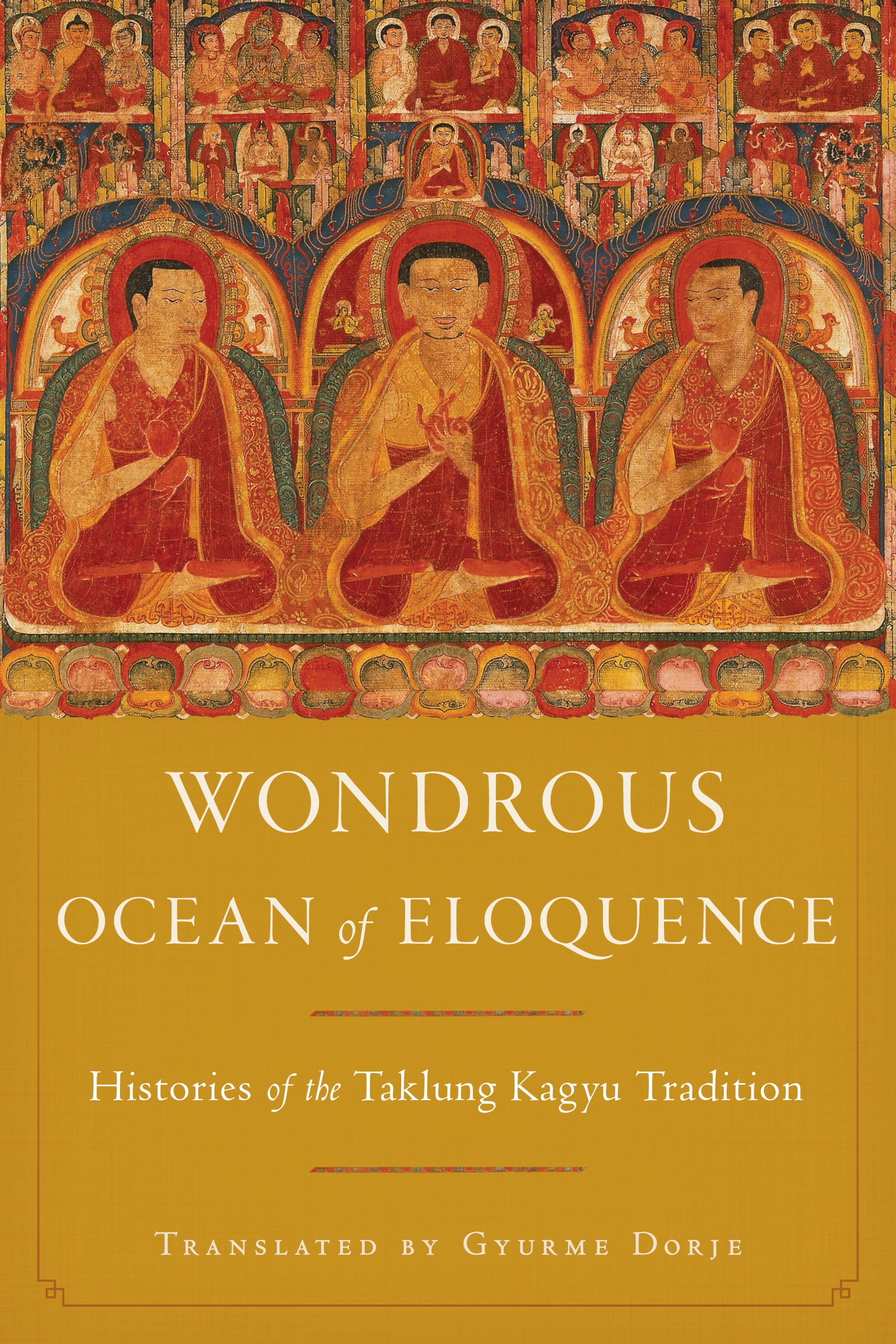While detailing the abbatial succession of the tradition’s two main monastic seats, Taklung and Riwoche Monasteries, it is also broad and vast in scale, going back to sixth-century BCE India to include early Indian Buddhist canon formulation, moving then to narratives on the Tibetan Kagyu lineage holders (Marpa, Milarepa, Gampopa), to the twelfth-century founding of the Taklung sect in Tibet, and then all the way through to the early twentieth century, which saw Tibet’s first modern military and cultural conflicts both within the country and with Chinese, Mongol, and Gorkha forces.