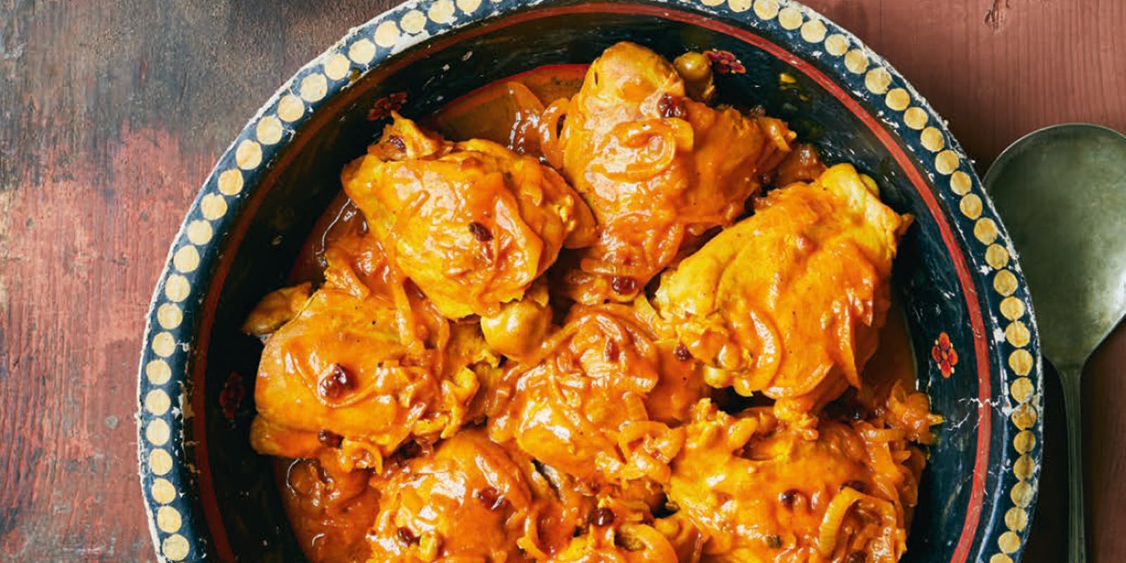 Pour the saffron water over the chicken. Add the fried onion and tomato purée mixture, the lemon juice and barberries and stir well.