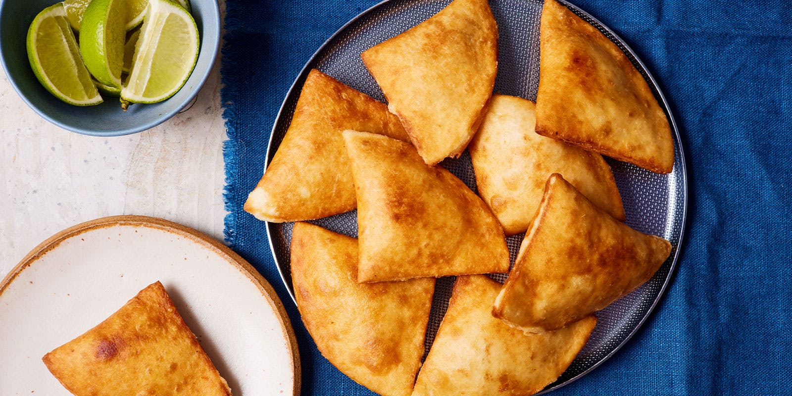 5. Heat the oil for deep-frying in a large saucepan on a medium-high heat until it reaches 180°C. Fry the samosas in batches for 1 minute on each side until golden all over, then drain on kitchen paper. These are best eaten fresh on the day they are cooked.