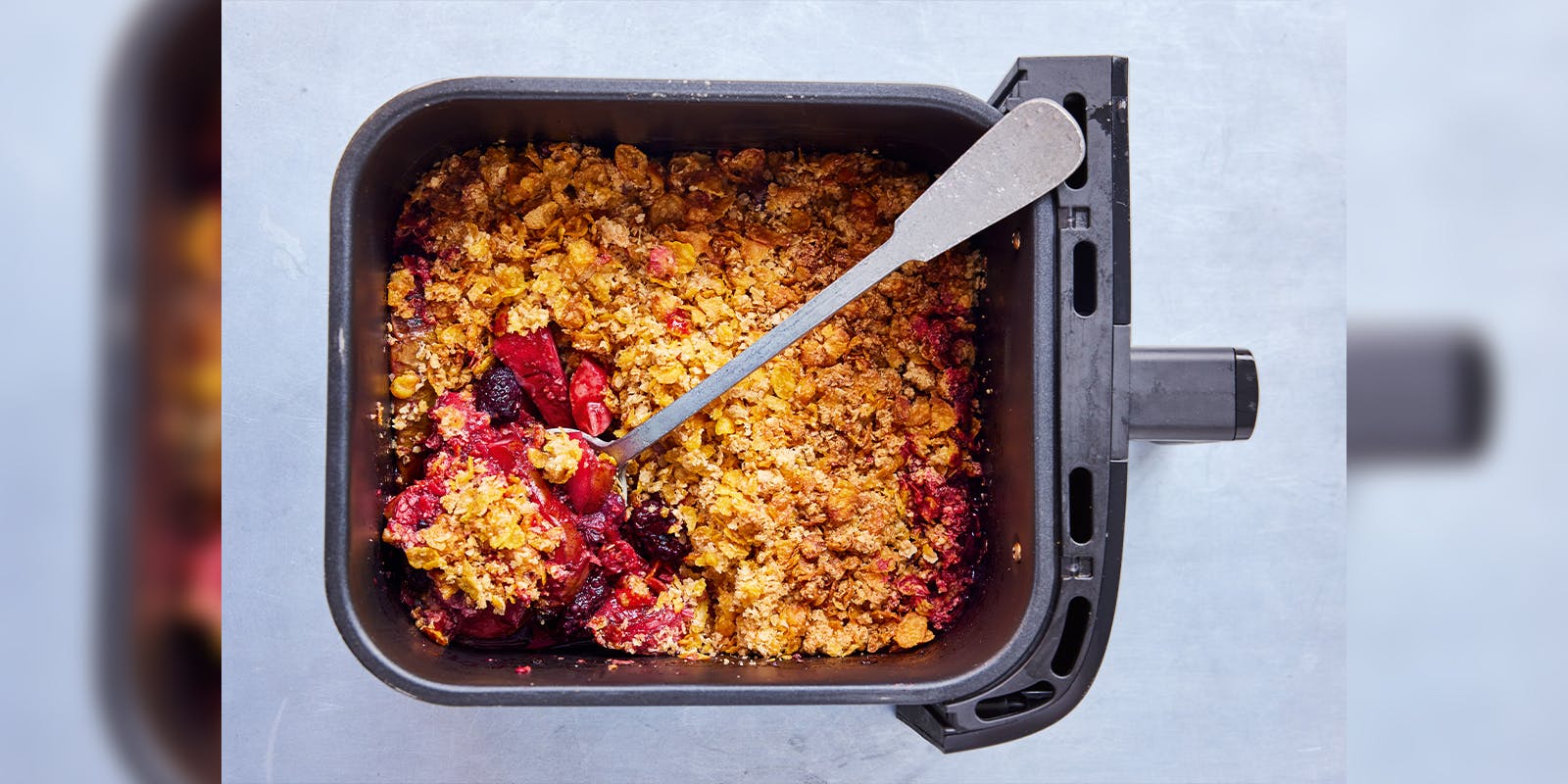 Scatter the crumble mixture over the fruit and cook for another 10 minutes at 180ºC, or until golden and bubbling, then dish up straight from the drawer. Great with custard, crème fraîche or ice cream.